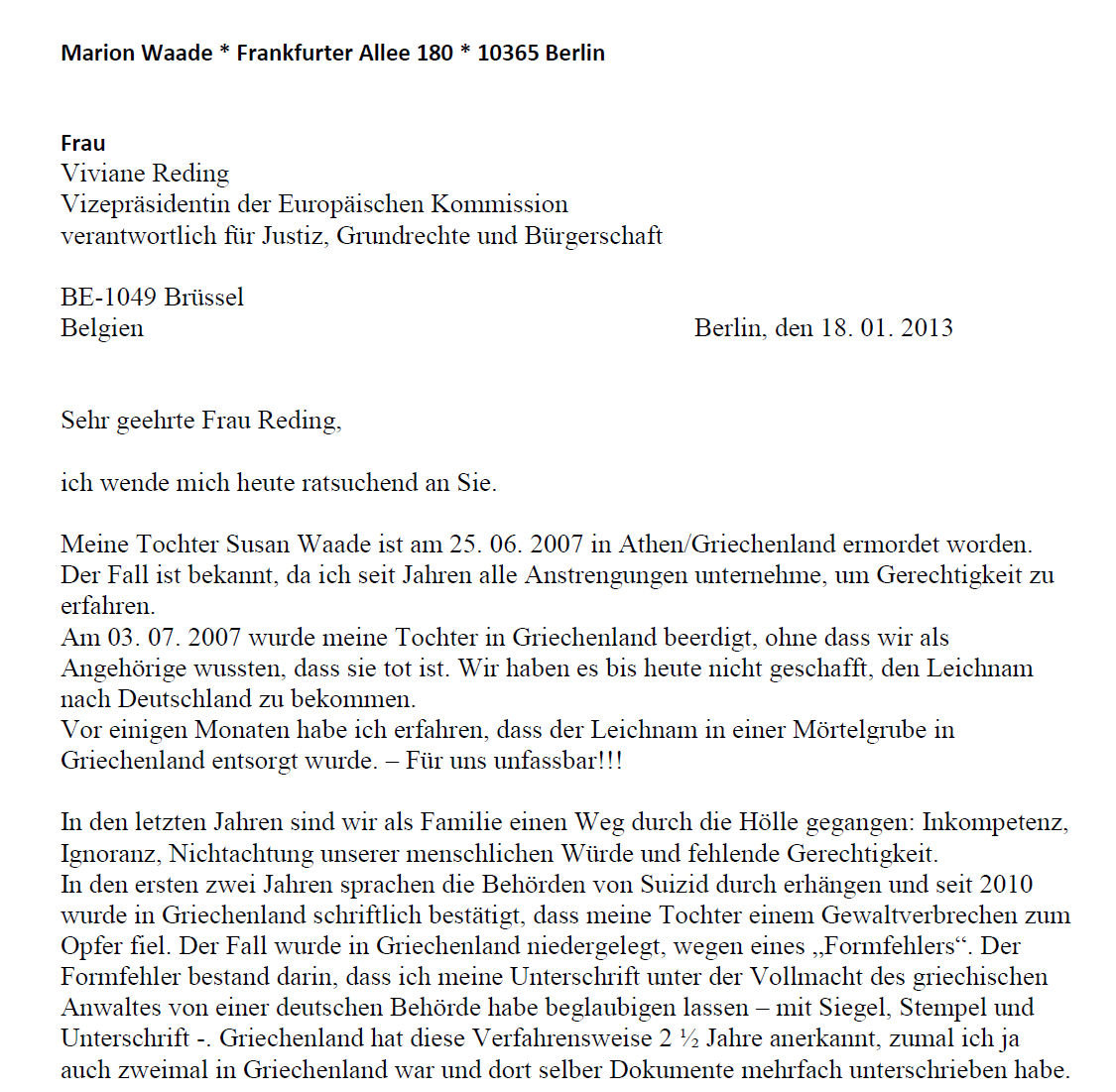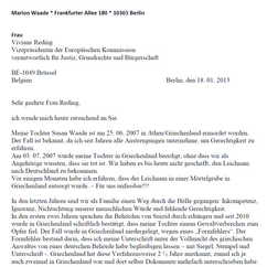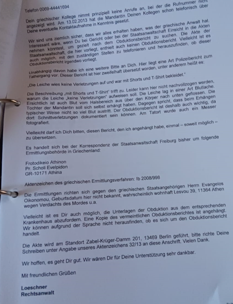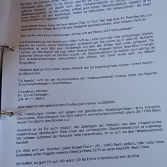 „Soweit Sie bemängeln, dass ein Polizeibeamter auf dem Vorgangsdeckblatt „Keine Straftat“ vermerkte hat, kann ich angeben, dass diese Randnotiz auf das weitere Verfahren keinen Einfluss gehabt hat. Es ist bei der Staatsanwaltschaft Berlin ein Verfahren wegen Mordes eingeleitet worden. Dieses Verfahren ist an die zuständige Staatsanwaltschaft Freiburg abgegeben worden… Auf die Sachbehandlung des Falles durch die griechischen Strafverfolgungsbehörden haben die Berliner Justizbehörden keinen Einfluss.“
