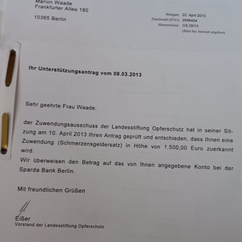 Das tat ich dann auch. Ich wollte es nicht glauben: nach Prüfung erhielt ich tatsächlich die Mitteilung, dass ich einen Schmerzensgeldersatz in Höhe von 1.500,00 EUR erhalte. Dieser Betrag wurde auch recht schnell überwiesen. Dafür danke ich noch einmal herzlich!