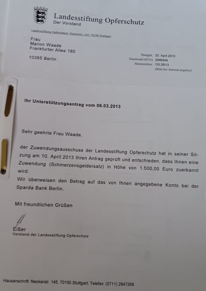 Unser Rechtsanwalt hat um eine Begründung der Niederlegung gebeten, warum das Verfahren abgeschlossen wurde. Die Abgabe einer Begründung wurde abgelehnt. Daraufhin bezog sich unser Anwalt auf das „Informationsfreiheitsgesetz“ und bestand auf eine Begründung. Daraus folgte in den Jahren später ein sehr unschönes Verfahren vor dem Verwaltungsgericht Berlin.