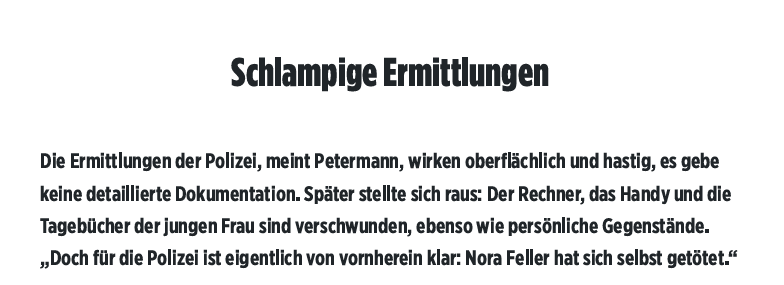 Wie Top-Profiler als Autor Mörder zur Strecke bringt - FOCUS online Mehrfachschock für die Eltern der jungen Nora Die Erzählung über Petermanns Rekonstruktion der Todesumstände von Nora Feller beginnen 2019 in einer Hotellobby in Ost Berlin, wo die Eltern ihn um Hilfe bitten. Sie sind fest davon überzeugt, dass ihre Tochter sich nicht selbst tötete, sondern Opfer eines Gewaltverbrechens wurde. Die Eltern der jungen, zart gebauten und cleveren jungen Frau erheben schwere Vorwürfe gegen die griechischen Behörden, fühlen sich auch von deutschen im Stich gelassen und hegen seit langem eine schrecklichen Verdacht gegen Noras 20 Jahre älteren Ex-Freund, den griechischen Musiker Potis Katzanis*.