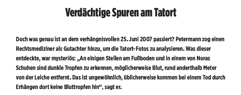 Was ein erster klarer Hinweis auf einen gewaltsamen Tod von Nora Feller wäre. Je erfahrener ein Rechtsmediziner ist, desto vorsichtiger wird er laut Petermann, Vermutungen über Tötungsdelikt anzustellen. Und beim Fall von Nora Feller muss er besonders vorsichtig sein. Vor allem, weil viele Fakten sich längst nicht mehr überprüfen lassen. Umso mehr ist Petermann überrascht, als ihm der Rechtsmediziner ein paar Tage später nach Übergabe der Ermittlungsergebnisse mitteilt, das beim Tod von Nora Feller „auf Grund der Befunde an der Leiche und in der Umgebung der Toten ein hochgradiger Verdacht auf ein Tötungsdelikt besteht“, so der Profiler. Nora Feller, da ist sich der Rechtsmediziner fast sicher, „ist durch einen kombinierten Angriff auf den Hals, durch Strangulation und durch scharfe Gewalt gestorben“. Wiederaufnahme des Ermittlungsverfahrens beantragt Mittlerweile ist Fellers Anwalt Papadakis dabei, das rechtsmedizinische Gutachten von Petermanns Bekanntem, das ebenfalls kostenlos verfasst wurde, gemeinsam mit anderen Ermittlungsergebnissen ins Griechische zu übersetzen, um die Unterlagen dann bei den Staatsanwaltschaften in Griechenland und in Deutschland einzureichen. Bei der deutschen Justiz ist mittlerweile um ein Wiederaufnahmeverfahren der Ermittlungen ersucht worden.