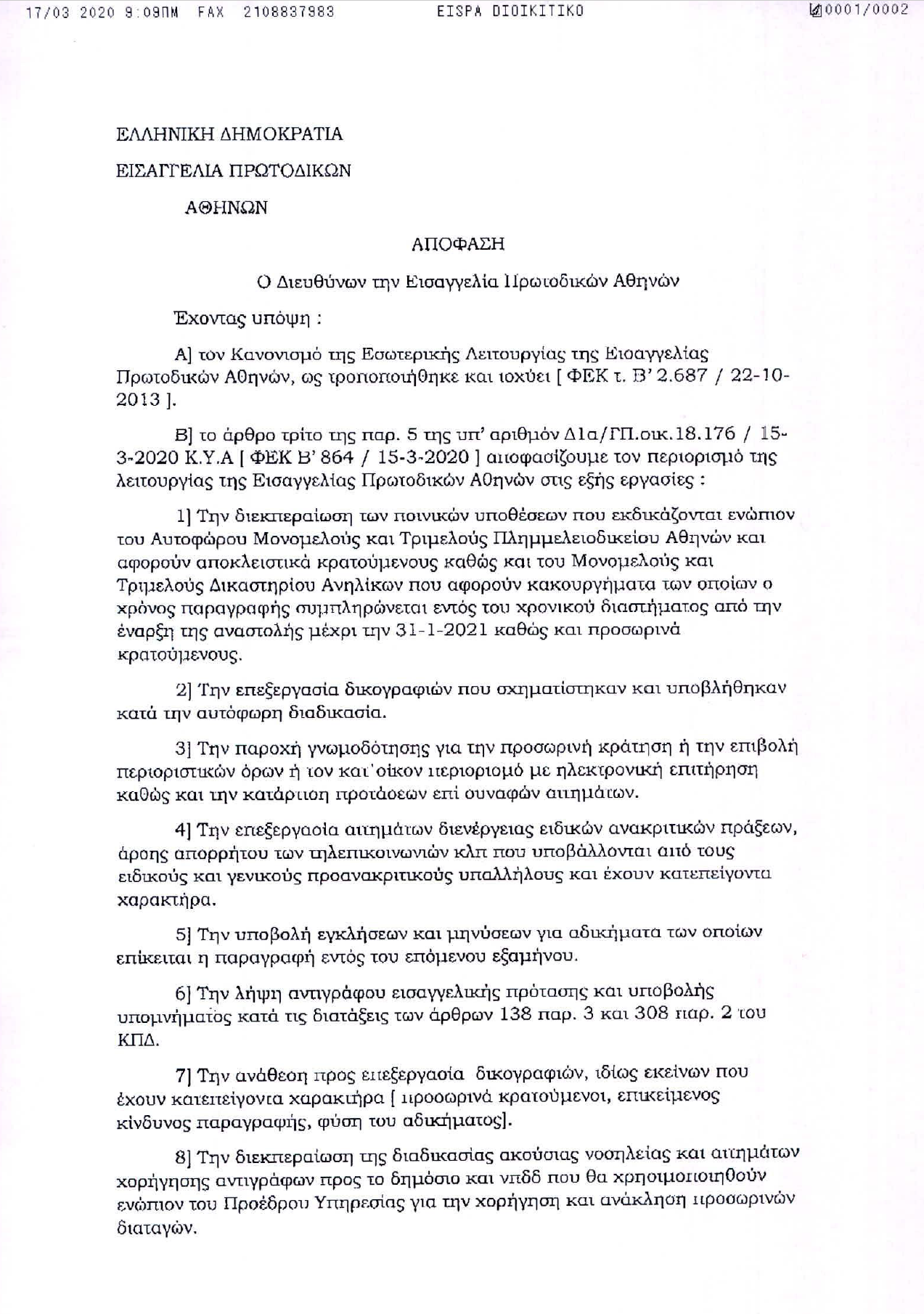 in Griechenland ist die Staatsanwaltschaft Athen seit dem 15. März geschlossen (ich lege die entsprechende Anordnung als PDF Datei bei) und nur eiligste Sonderfälle werden bedient.